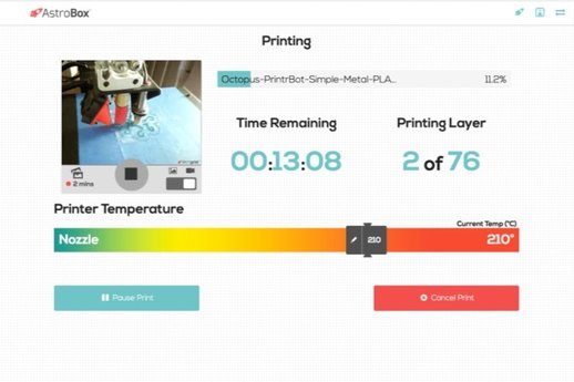 這個叫AstroBox的小設備由Raspberry Pi推動,并附有一個軟件程式,只要把AstroBox接駁到3D打印機上,然后再連上兼容Linux系統的鏡頭,用家就可以隨時隨地遠端看到3D打印情況,甚至可以把打印狀況拍下。
