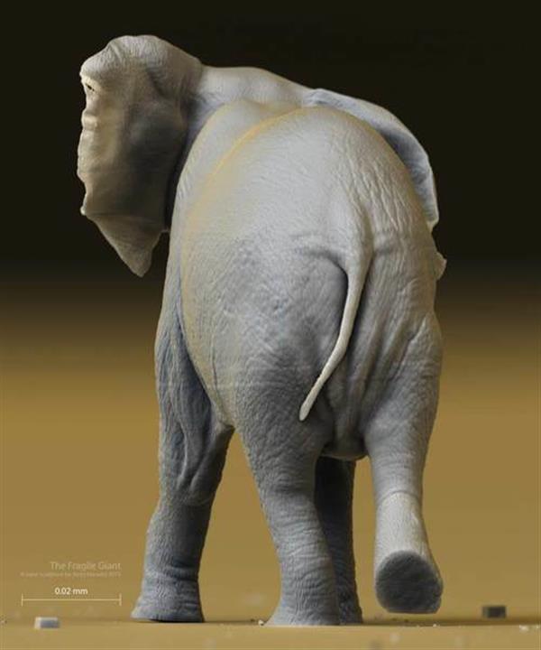 近日,有位藝術家Jonty Hurwitz創作了一只體積比塵埃更小的大象,連肉眼也看不清楚。這頭大象的長度只有約0.1mm。Jonty Hurwitz說這個藝術品的名稱叫脆弱的巨人(Fragile Giant),利用了新型3D列印技術-多光子光刻(Multiphoton Lithography) 去創造出來。